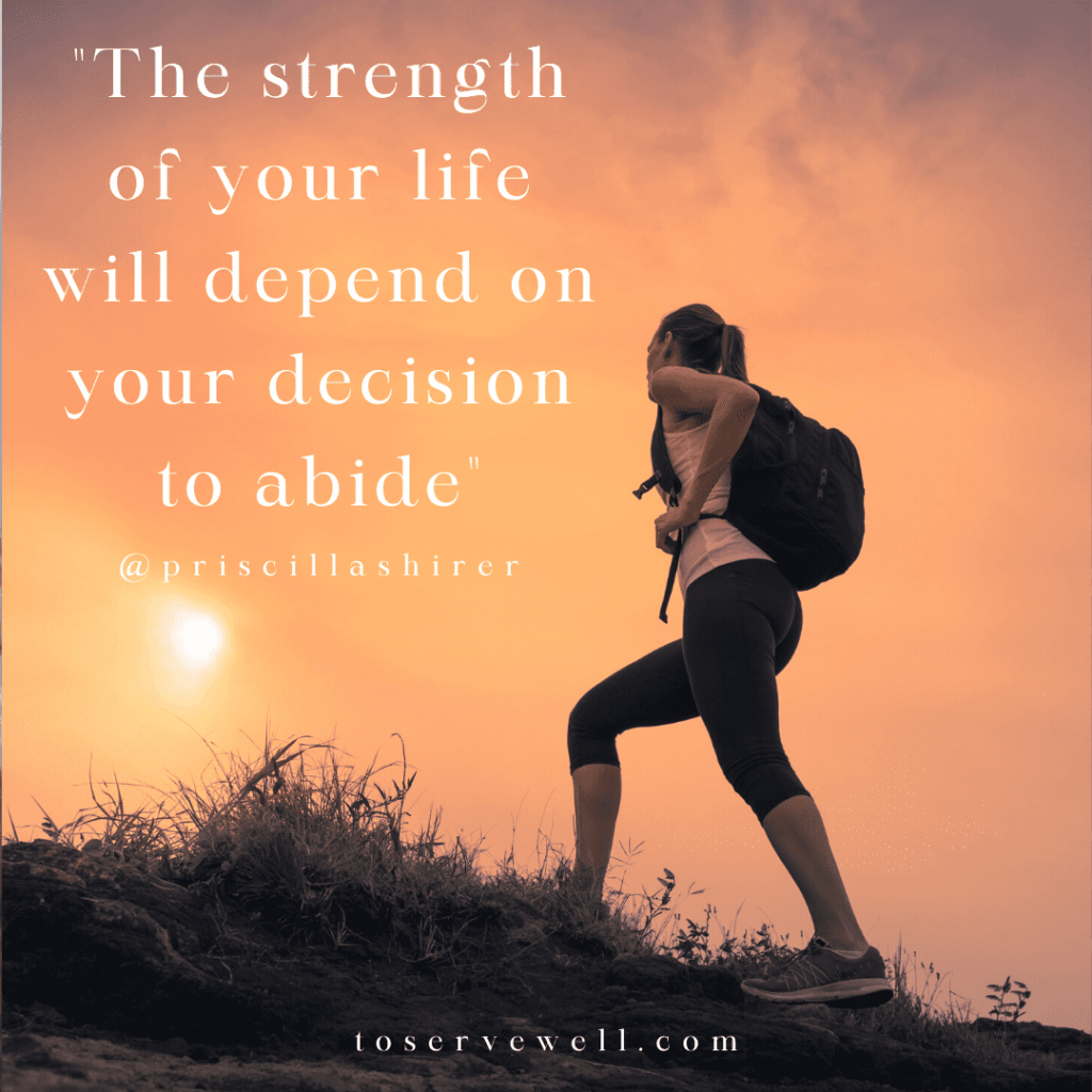What a powerful word. I love it when a strong word hits so hard that it stays with me. It’s not like I didn’t know the word, but when said in a certain way, or perhaps at a particular time, it just settles deep. Where does your mind go when you hear the phrase, ” The strength of my life will depend on your decision to abide?” So much to unpack…